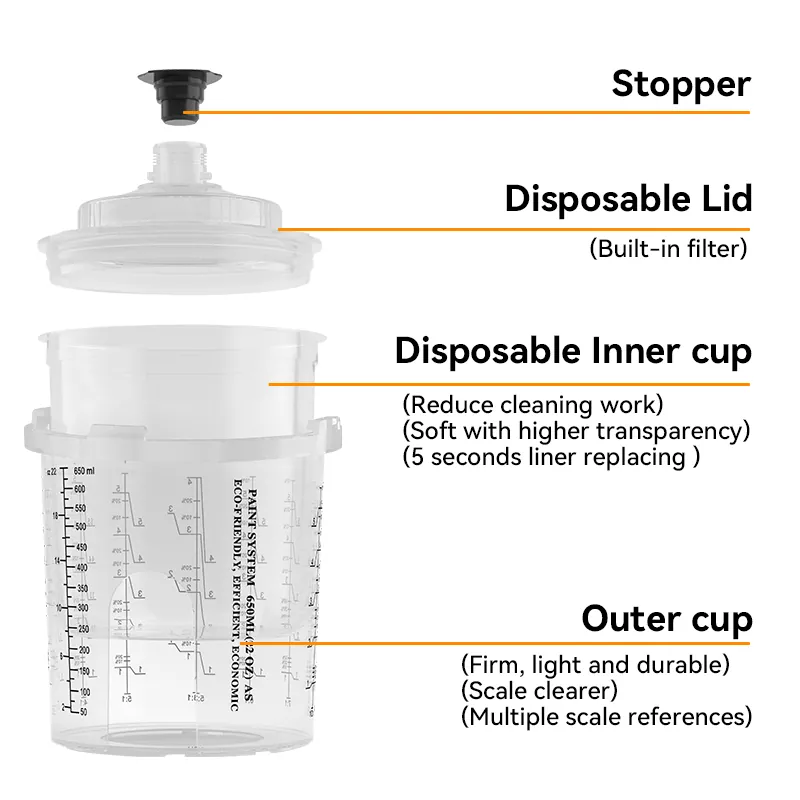 Kumpara sa tradisyonal na 1.0 serye, ang AYS3.1 Disposable Spray Gun Cup ay nagtatampok ng isang pinahusay na disenyo ng panlabas na tasa na may karagdagang window ng cut-out, na nagpapahintulot sa mga sprayer na madaling subaybayan ang pintura sa loob ng tasa. Ang integrated disenyo ng lock ay pinapadali ang mga pagbabago sa tasa at makabuluhang nagpapabuti sa kahusayan sa pag -spray.