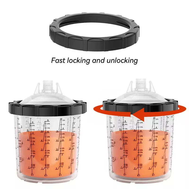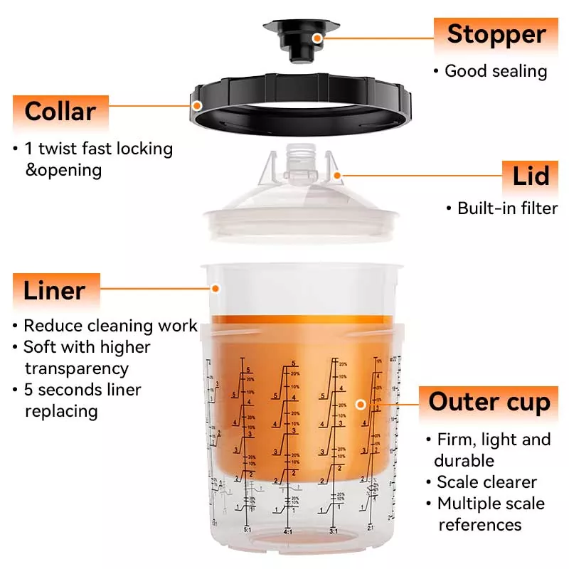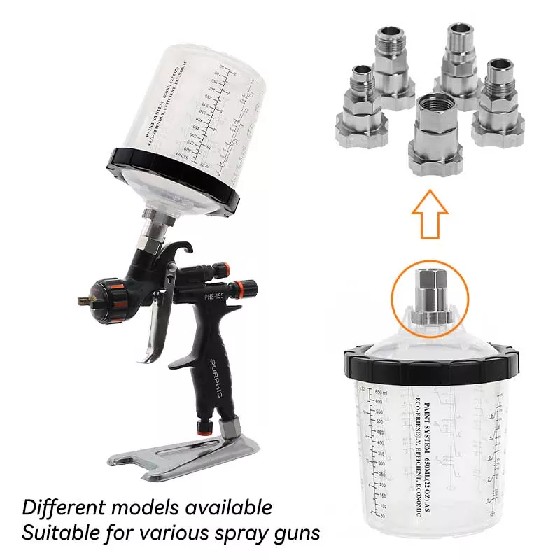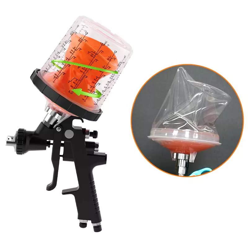 Ang 400ML Disposable Paint Cup System 1.0 na ito ay karaniwang pinapalitan ang tradisyunal na gravity feeds cup dahil hindi lang ito nakakatipid ng mas maraming pintura, ngunit pinahuhusay din nito ang kahusayan ng pagpipinta. Sa partikular, ang katangi-tanging disenyo ng awtomatikong spiral pababa ng liner kapag ang pagpipinta ay ginagawang ganap na nagamit ang pintura; samantala, iniiwasan ng mabilisang pag-lock at pagpapalit ng liner na disenyo ang paghuhugas ng tasa, na nagpapahintulot sa pagpipinta na maisagawa nang mahusay at paulit-ulit. Mayroon kaming mga adaptor para sa halos lahat ng tatak ng spray gun sa merkado upang matugunan ang mga pangangailangan ng karanasan ng iba't ibang mga mahilig sa spray gun. Ang adaptor ay gawa sa hindi kinakalawang na asero, na lumalaban sa kaagnasan ng pintura at napakatibay. Ang mahigpit na kumbinasyon ng liner na may takip ay nagsisiguro na ang sistema ng tasa ay hindi tumagas ng pintura habang nagpinta, at sumusuporta sa pangmatagalang pag-iimbak ng hindi nagamit na pintura upang maiwasan ang basura.
