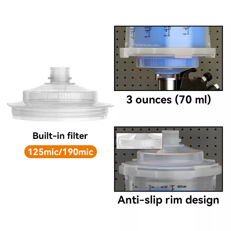 -Ang Ays3.1 Disposable Spray Cup Lid ay nagtatampok ng isang dobleng layer na konstruksyon na humahawak ng hanggang sa 3 ounces (70 ml) ng pintura sa ilalim ng filter.Ang takip ay nagpapabuti ng daloy ng pintura at pagkakapare-pareho, pagbabawas ng pintura ng pintura.